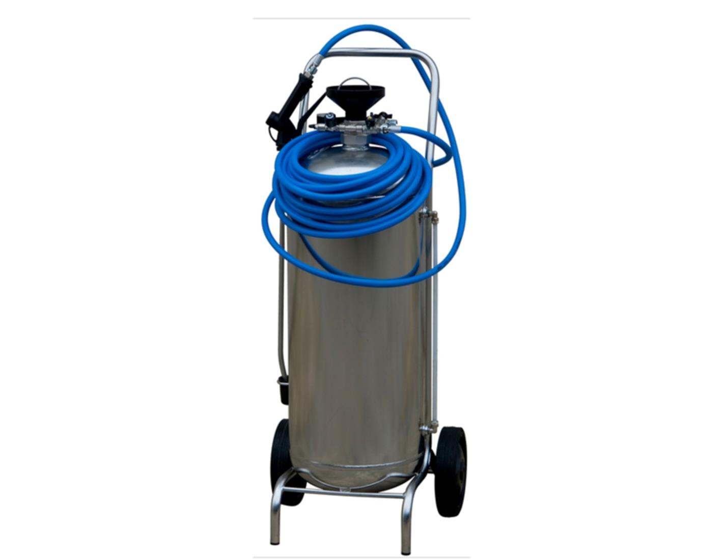 Stainless steel tank with a capacity of 50L. It is connected to the air circuit with a split nut. It has a manometer, safety valve, outlet air regulator, inlet air regulator, 3 injectors for foam thickening changes. and easy decompression system on the funnel head. Includes 5 meter long hose and plastic foam gun.